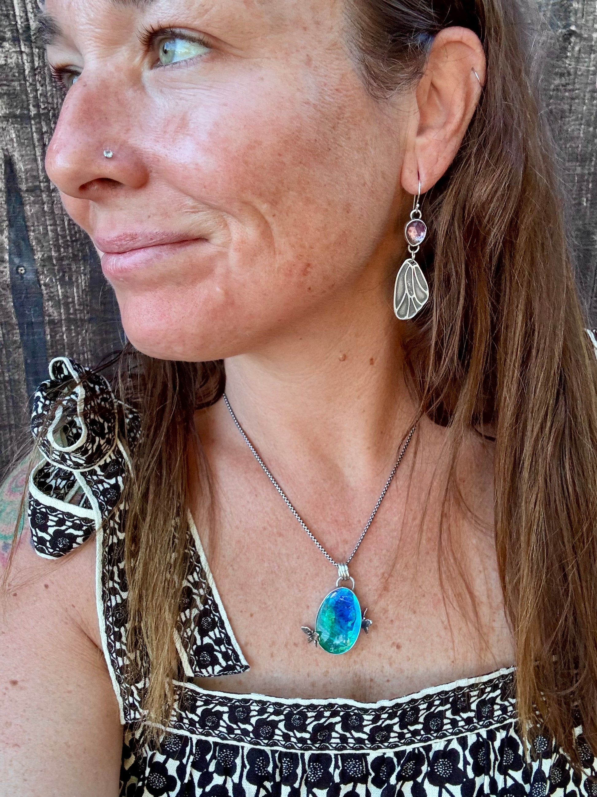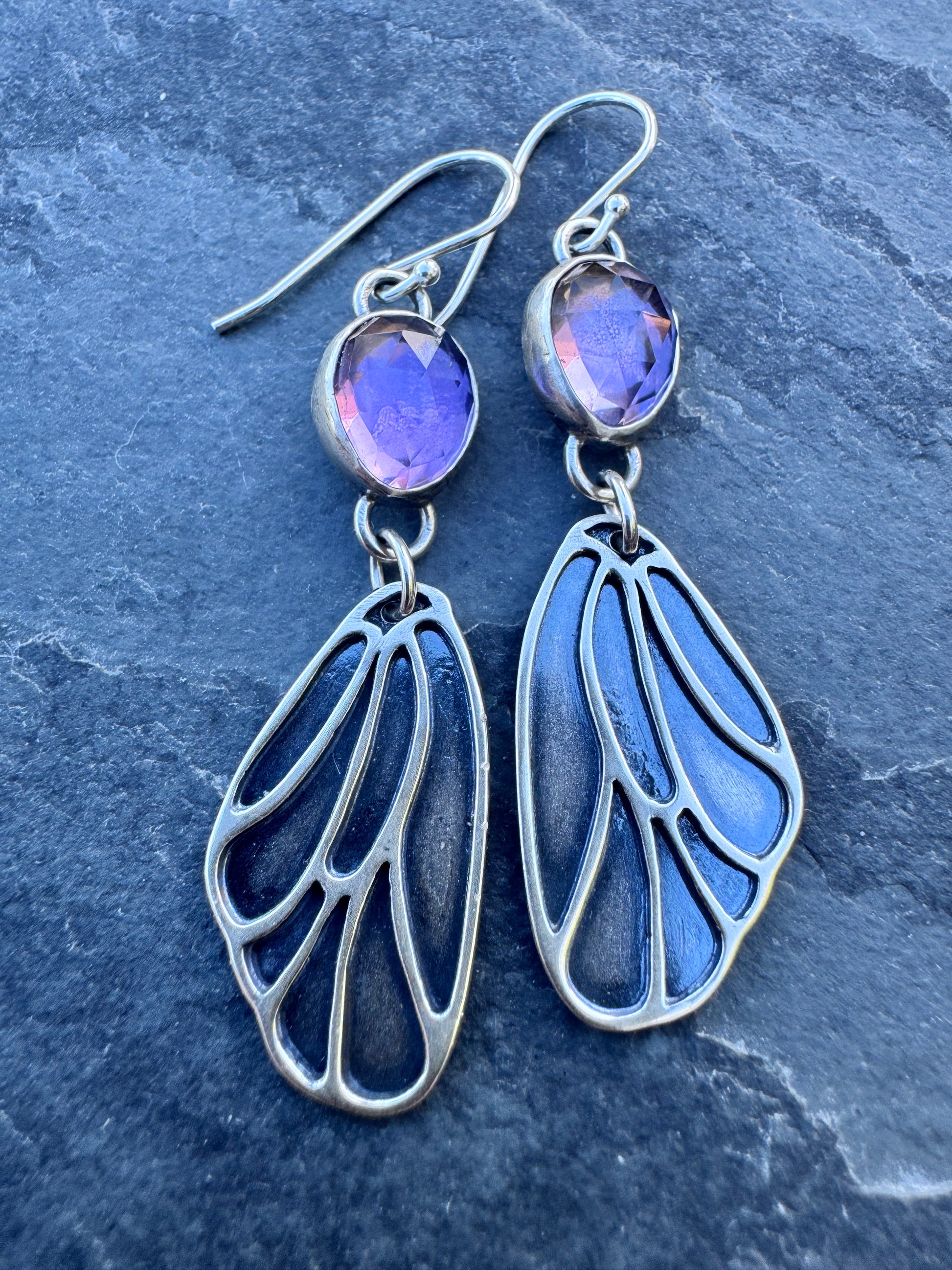 Featuring a stunning purple amethyst paired with a delicate carved wing detail, these dangles are full of graceful movement and vibrant color.