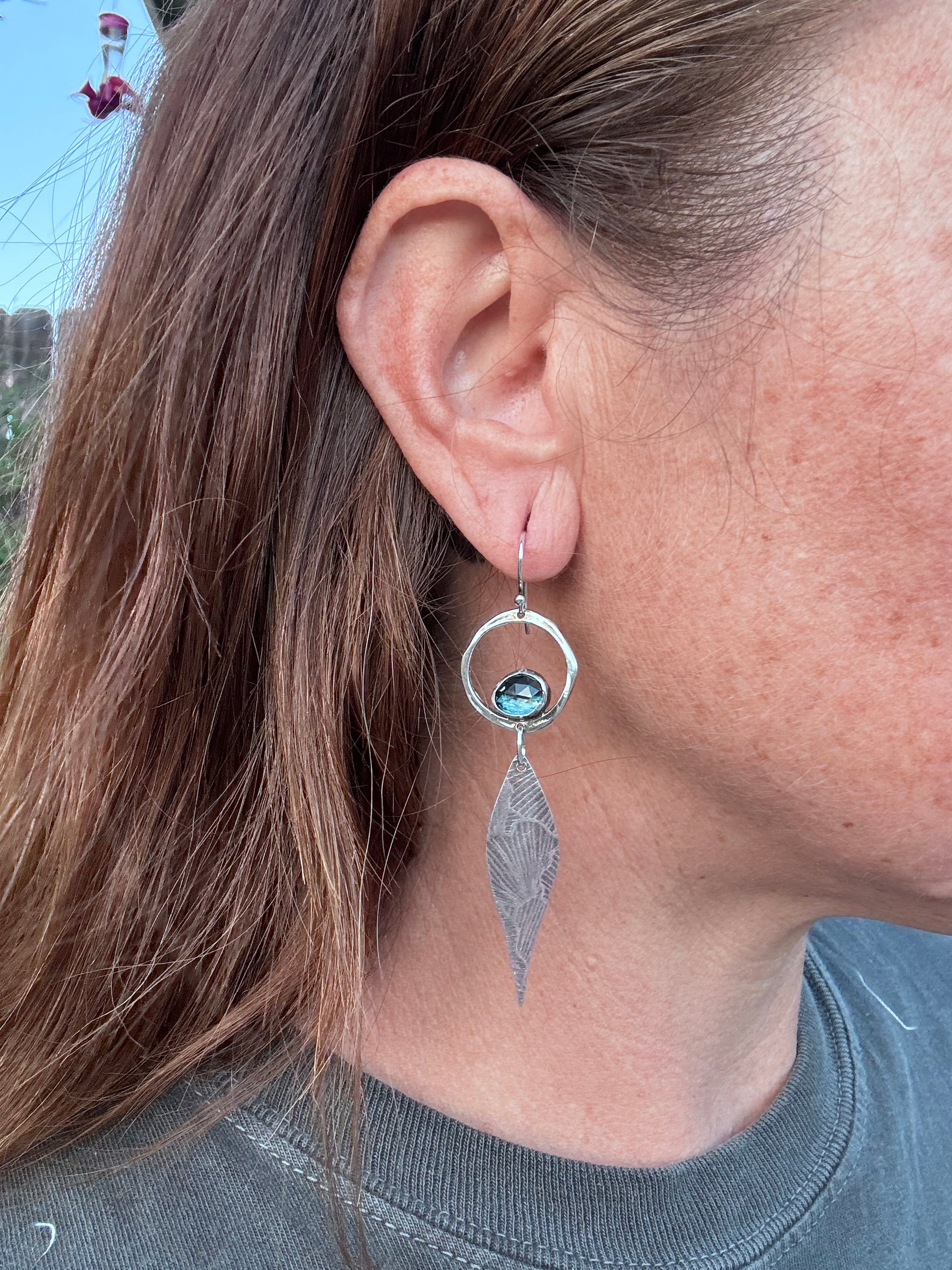 Another E&A signature design—rustic hoops set with sparkling London Blue Topaz. A playful textured dangle adds just the right detail. Lightweight, gorgeous, and so fun to wear…the perfect earring