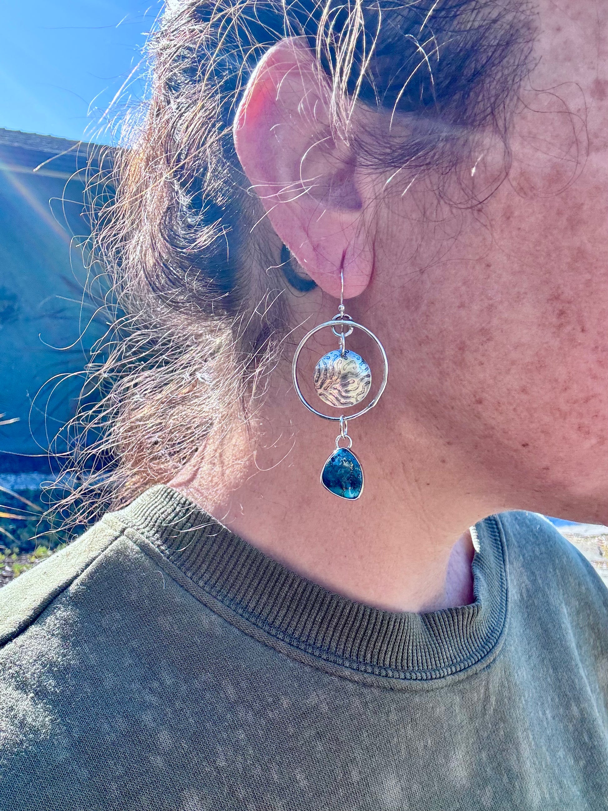 A mermaids dream earring. Nacozari turquoise dangles with textured coral print in the center of the hoop. Super lightweight, great movement. Sterling silver and stone.