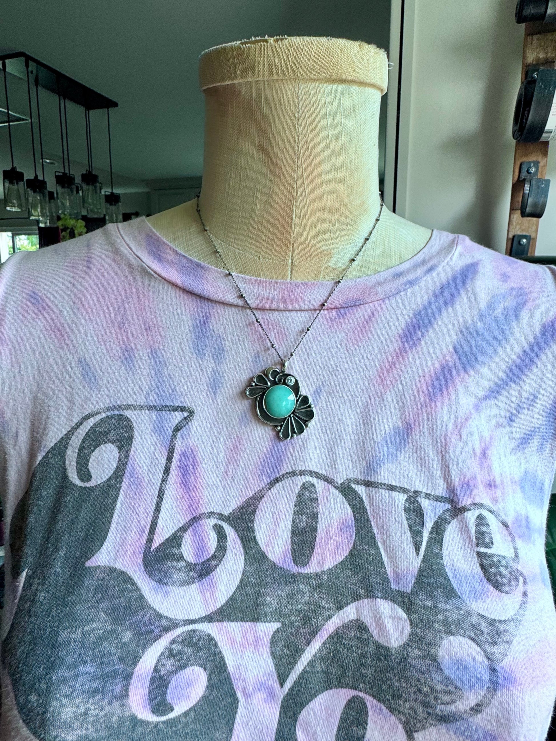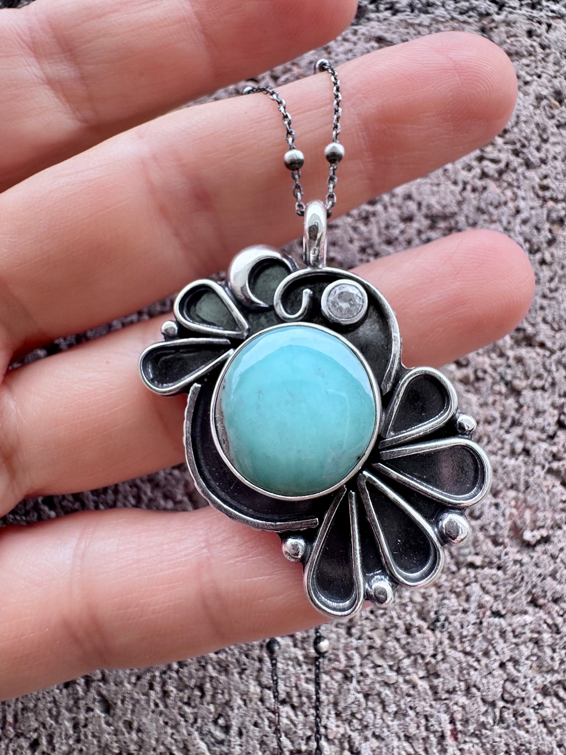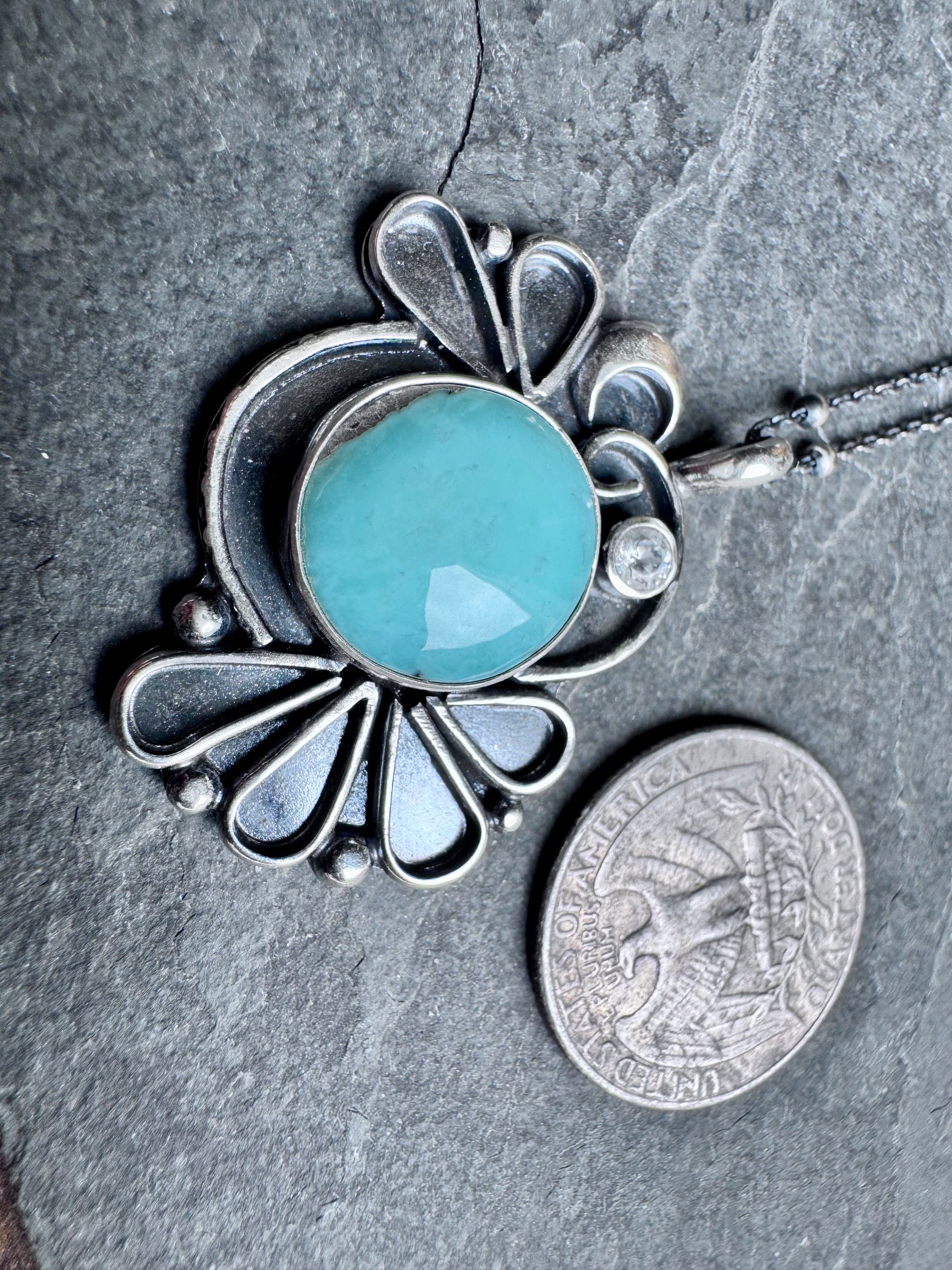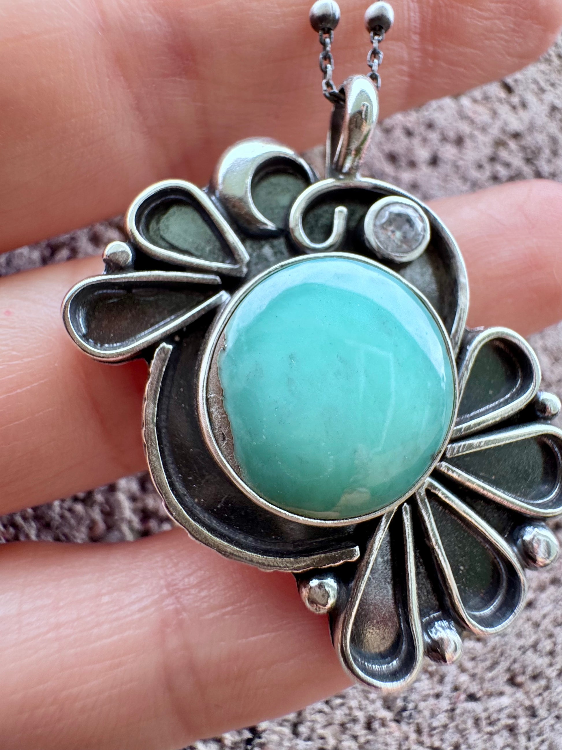 The bloom is blooming. The super fun, one of a kind, desert bloom, and cubic zirconia pendant has a joyful feel. Fun wire detail with the crescent moon right at the top. Just an all-around fun every day wear. Sterling silver and stone