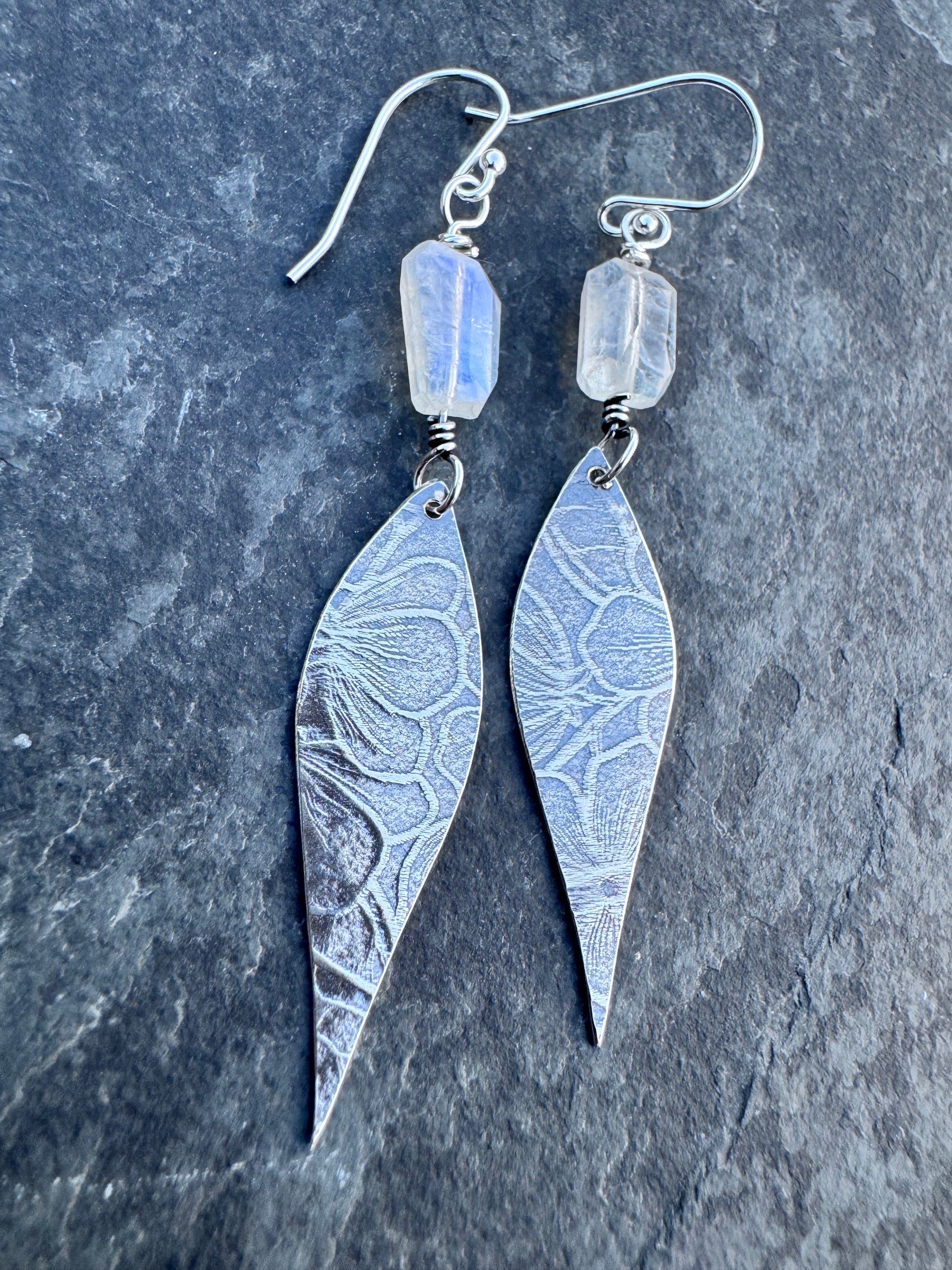 The perfect go-to earring—sterling silver with a dainty glowing moonstone and textured dangle. Cute, lightweight, and goes with absolutely everything.
