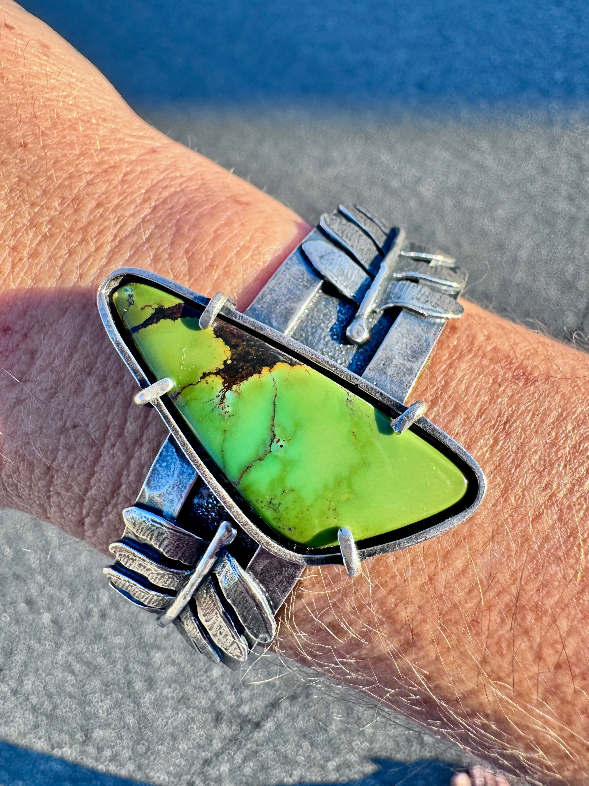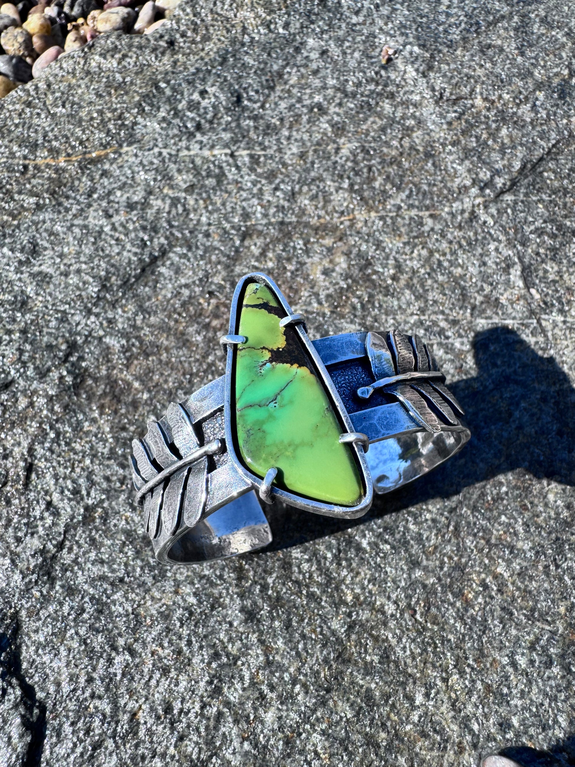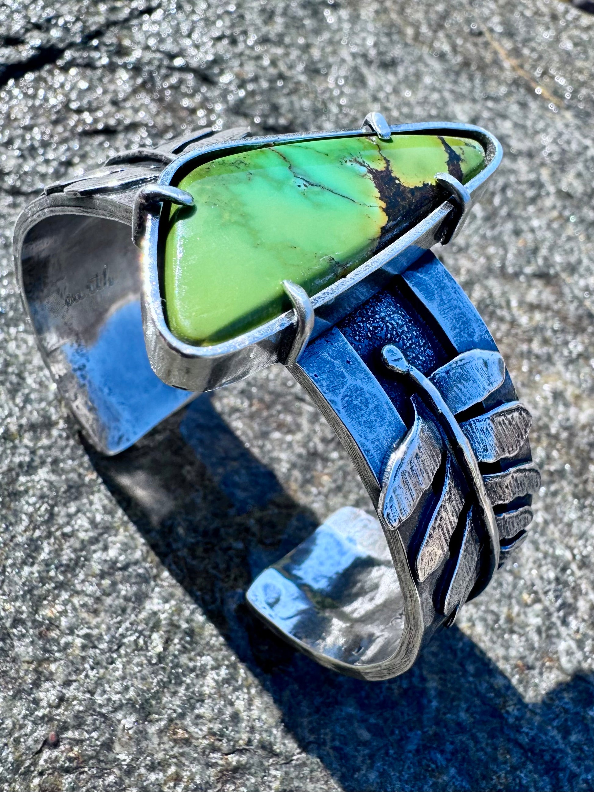 This one of a kind cuff is an absolute statement piece for any nature lover. Built from layered sheet and wire, it’s substantial, heavy duty, and made to last a lifetime. At its center sits a striking green turquoise, held securely in a thick bezel with a bold prong setting. Hand fabricated fern leaves wrap gracefully around the cuff, adding an organic, earthy feel that fern lovers will swoon over. 100% hand-fabricated, heirloom quality, and truly one of a kind.