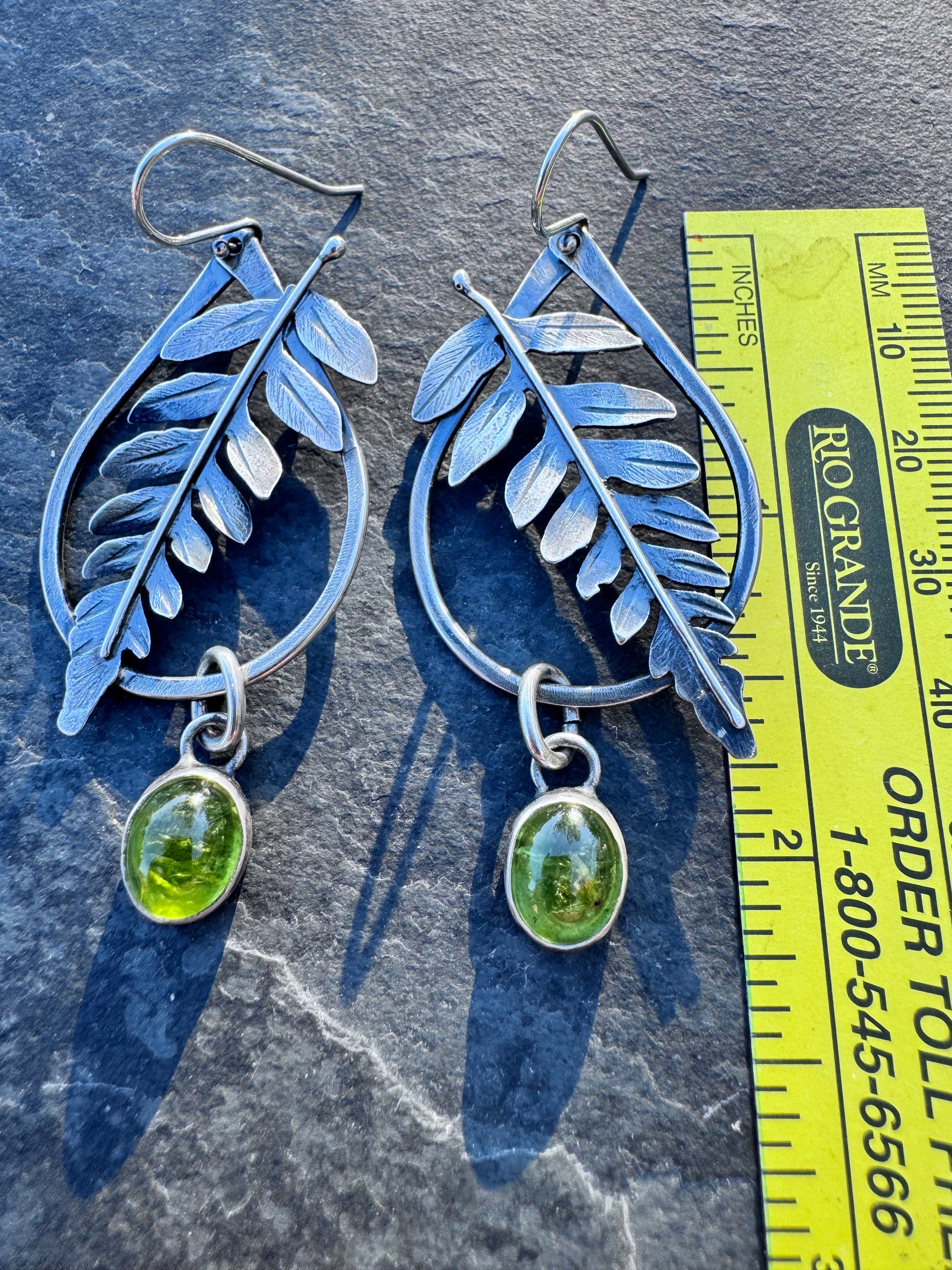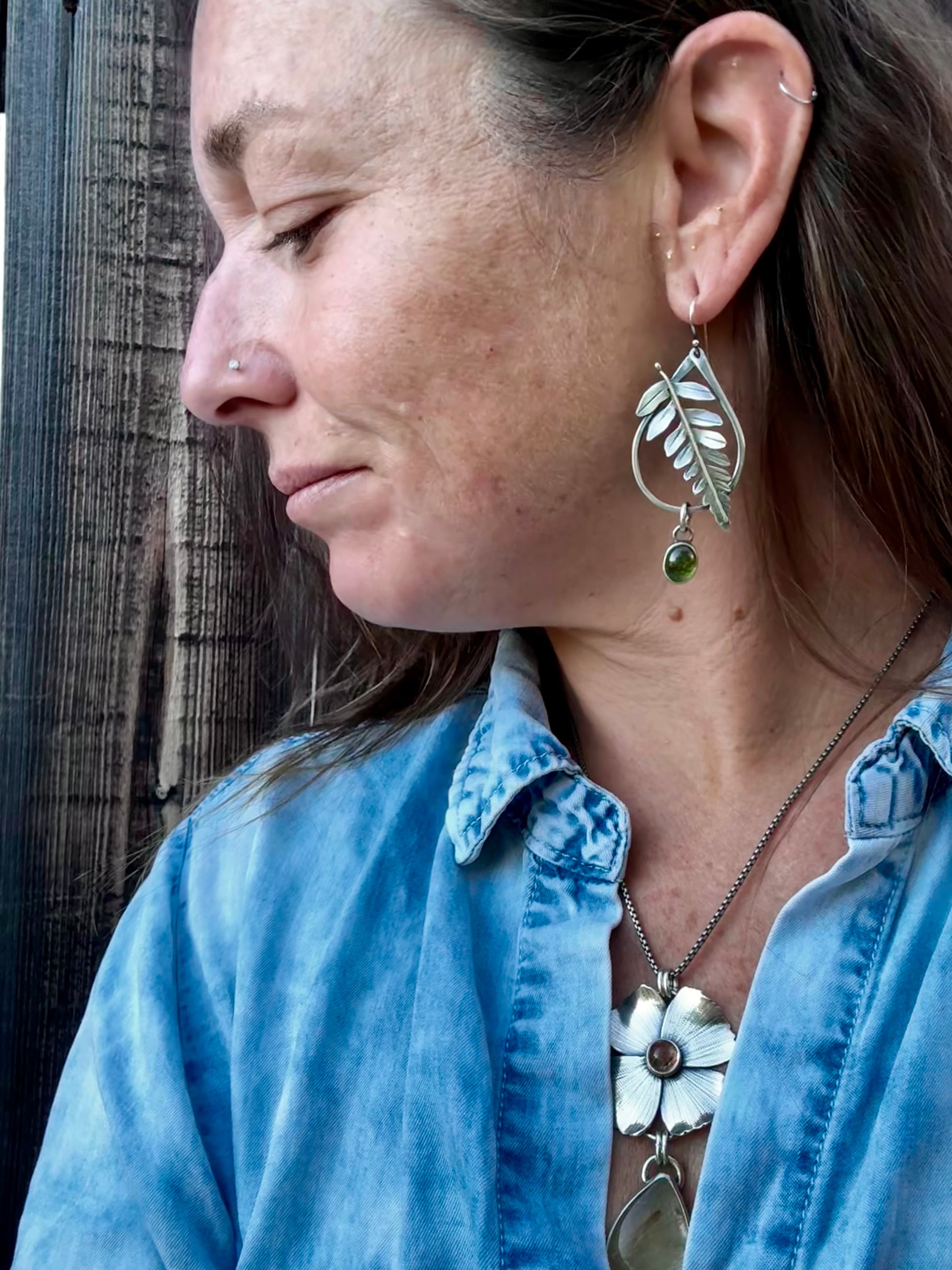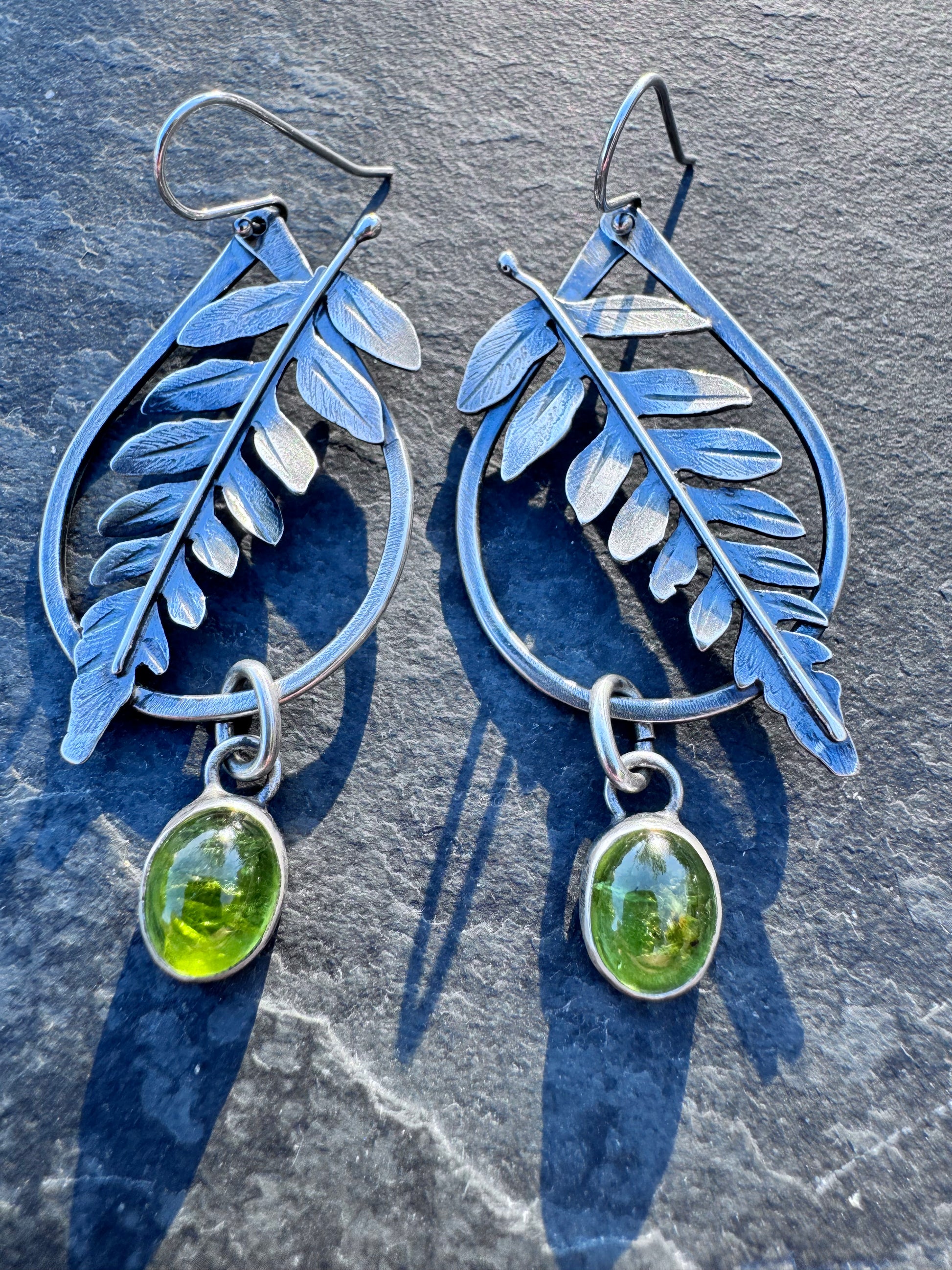 These fern earrings are made for the botanical babes. A fun, organic shaped hoop holds a hand fabricated fern, detailed to feel like you’ve stepped right into a fairy garden. Dangling below is a smooth peridot drop, glowing in the most luscious shade of green. Ferns and green stones truly the perfect pair.