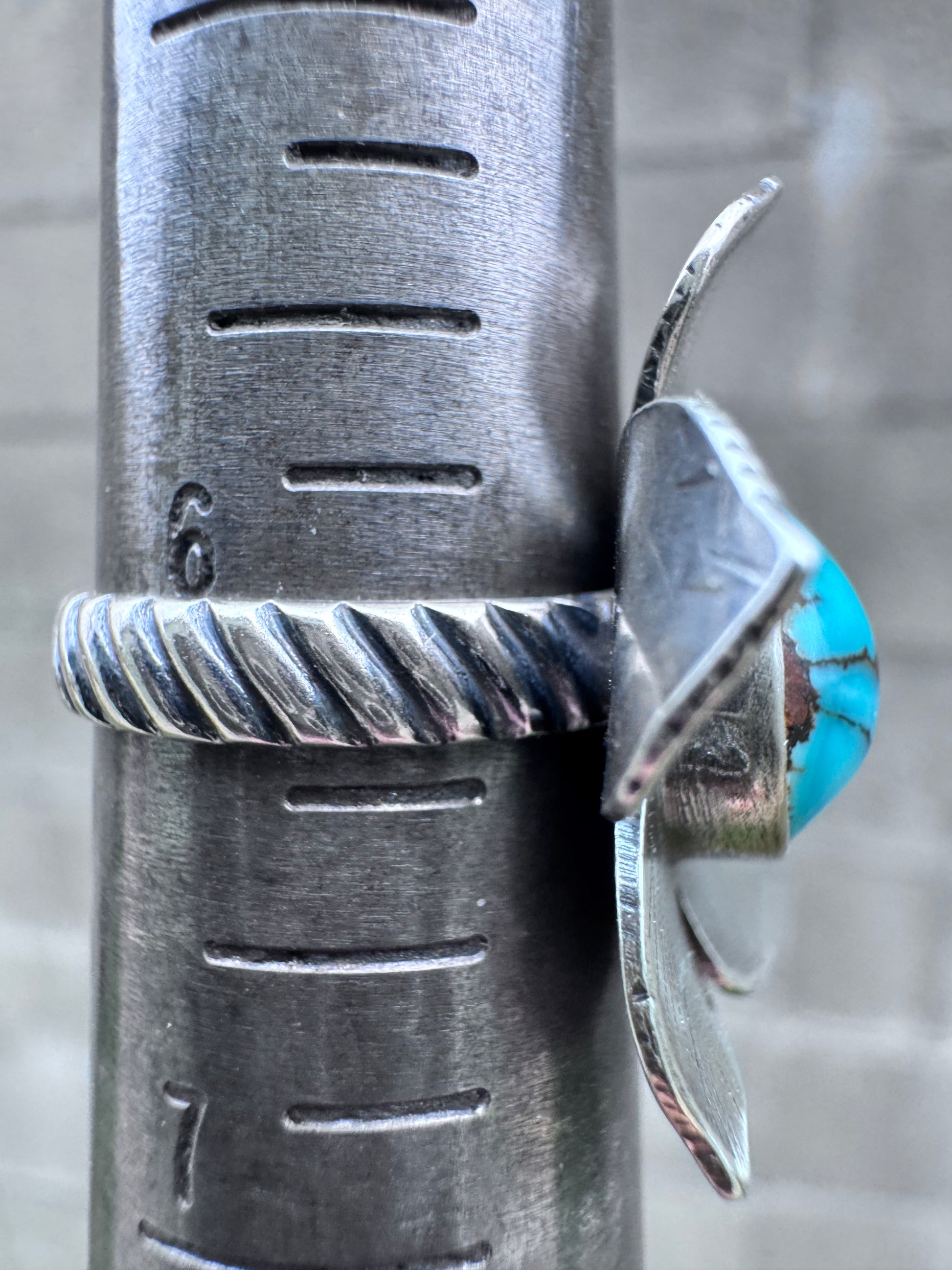 A super fun and cute flower ring. Perfect for special occasions or everyday wear. A cute little chunk of turquoise in the center. Fits a 6
