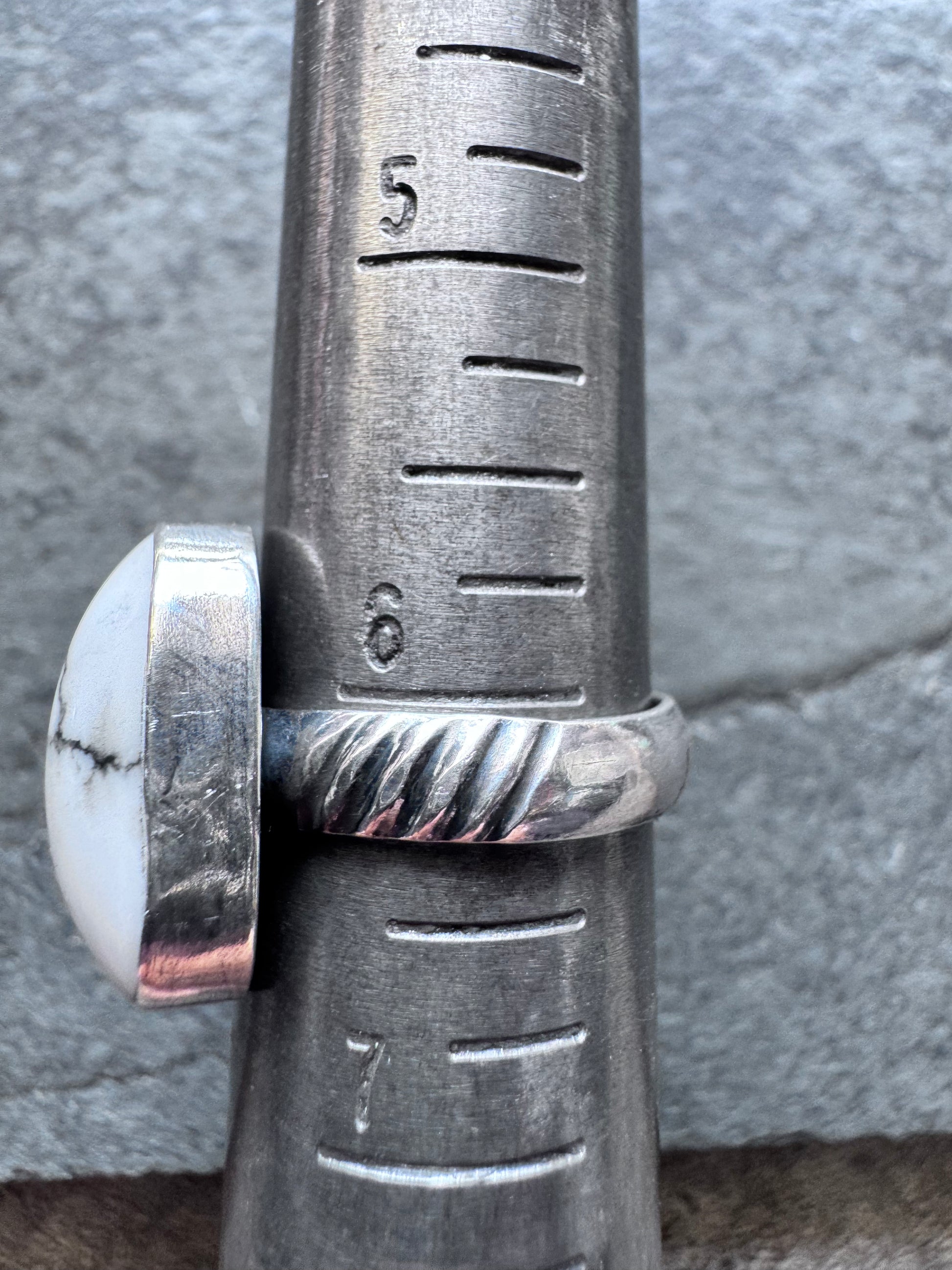 Super fun California howlite—pure white with striking black matrix, such a rad rock! Size 6, perfect for everyday wear