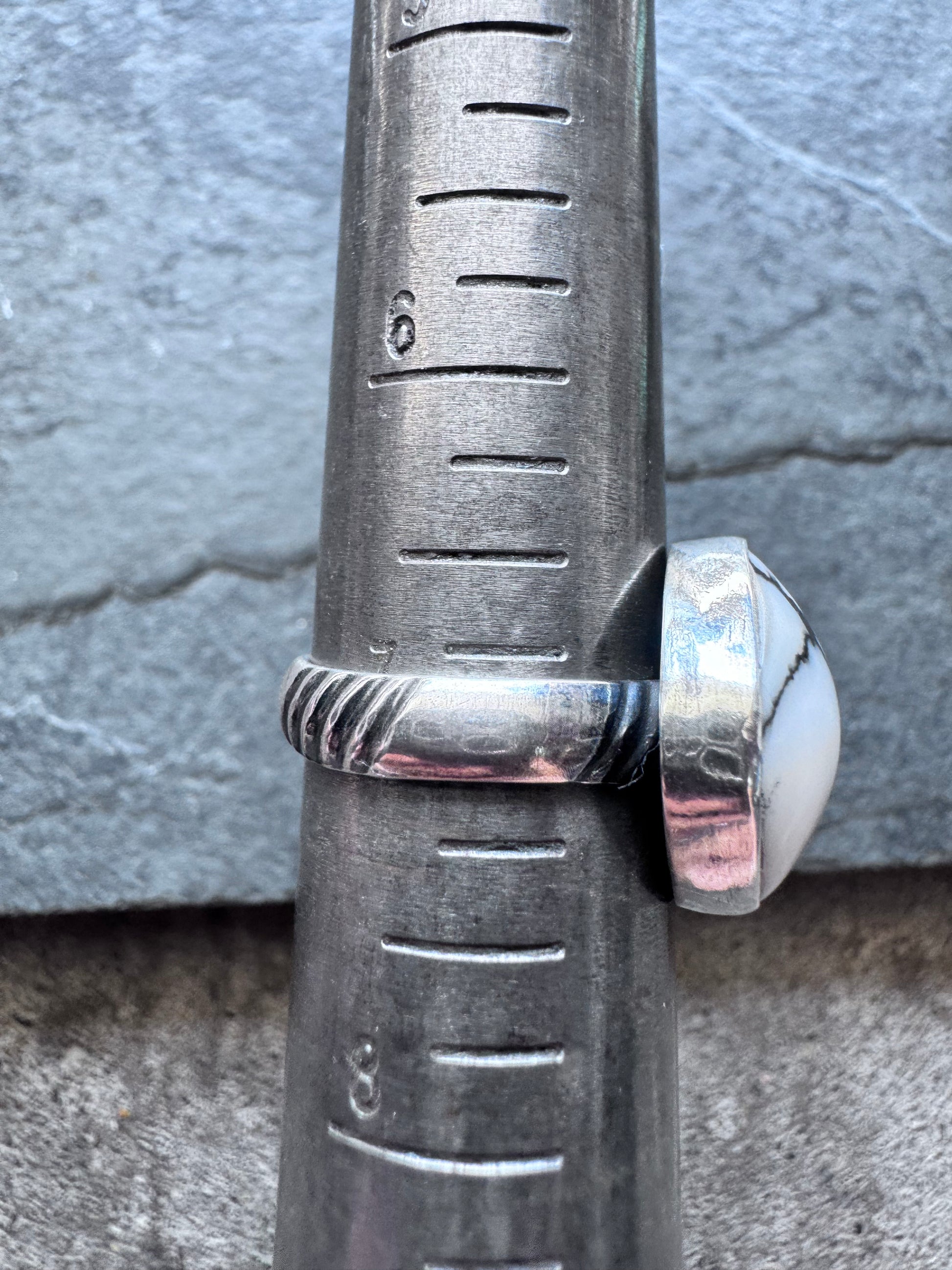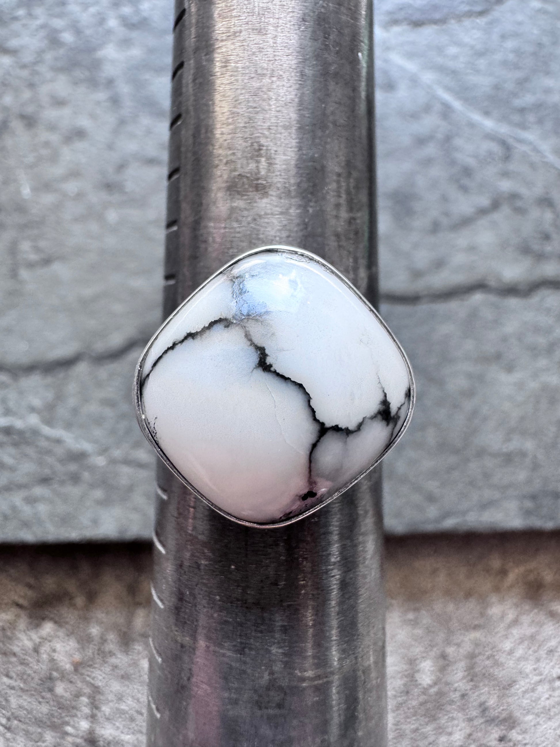 Super fun California howlite—pure white with striking black matrix, such a rad rock! Size 7, perfect for everyday wear