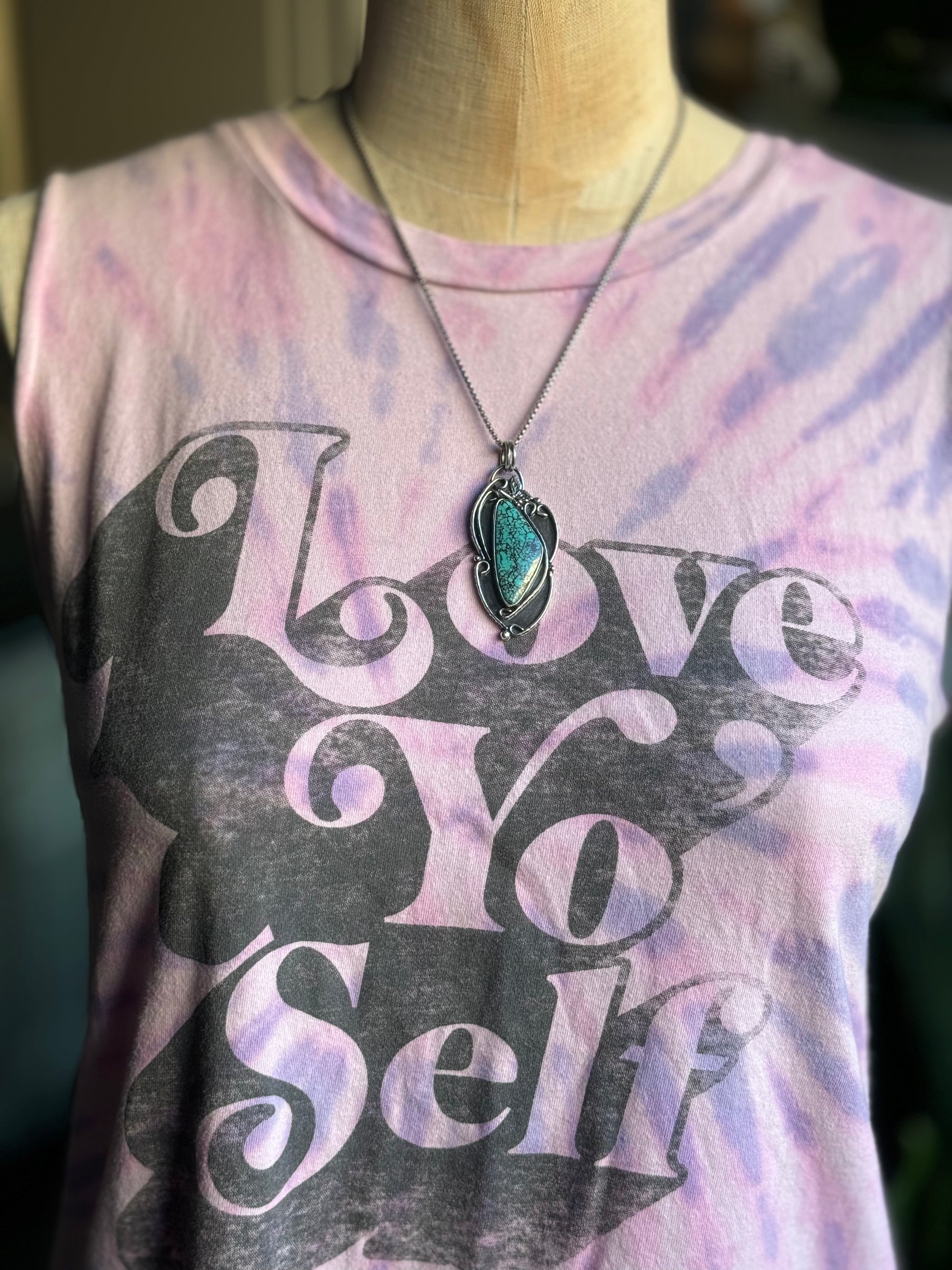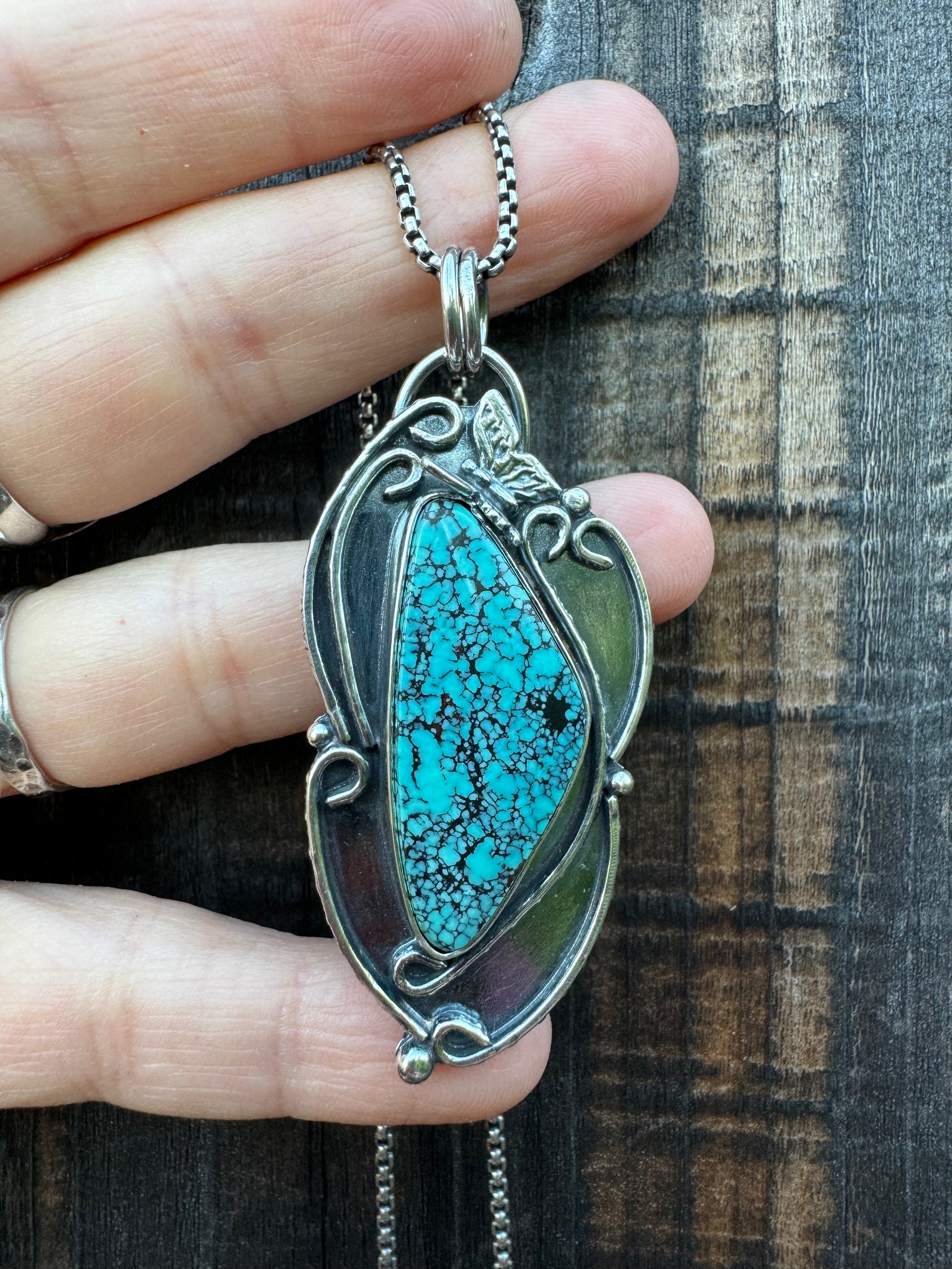 A whimsical flowing design with a beautiful piece of Hubei turquoise. Sterling silver pattern wire flowing around the stone with an addition of a butterfly for a perfect little detail. This one felt very symbolic. It was as if all 4 direction are just in flow swirling around this stone.