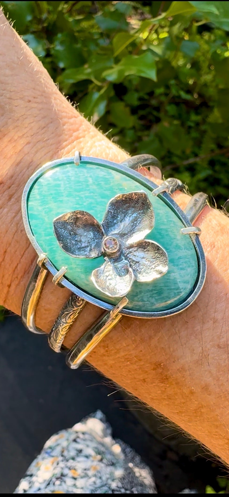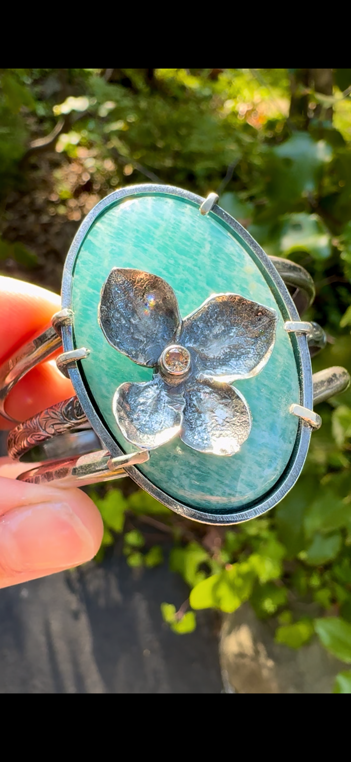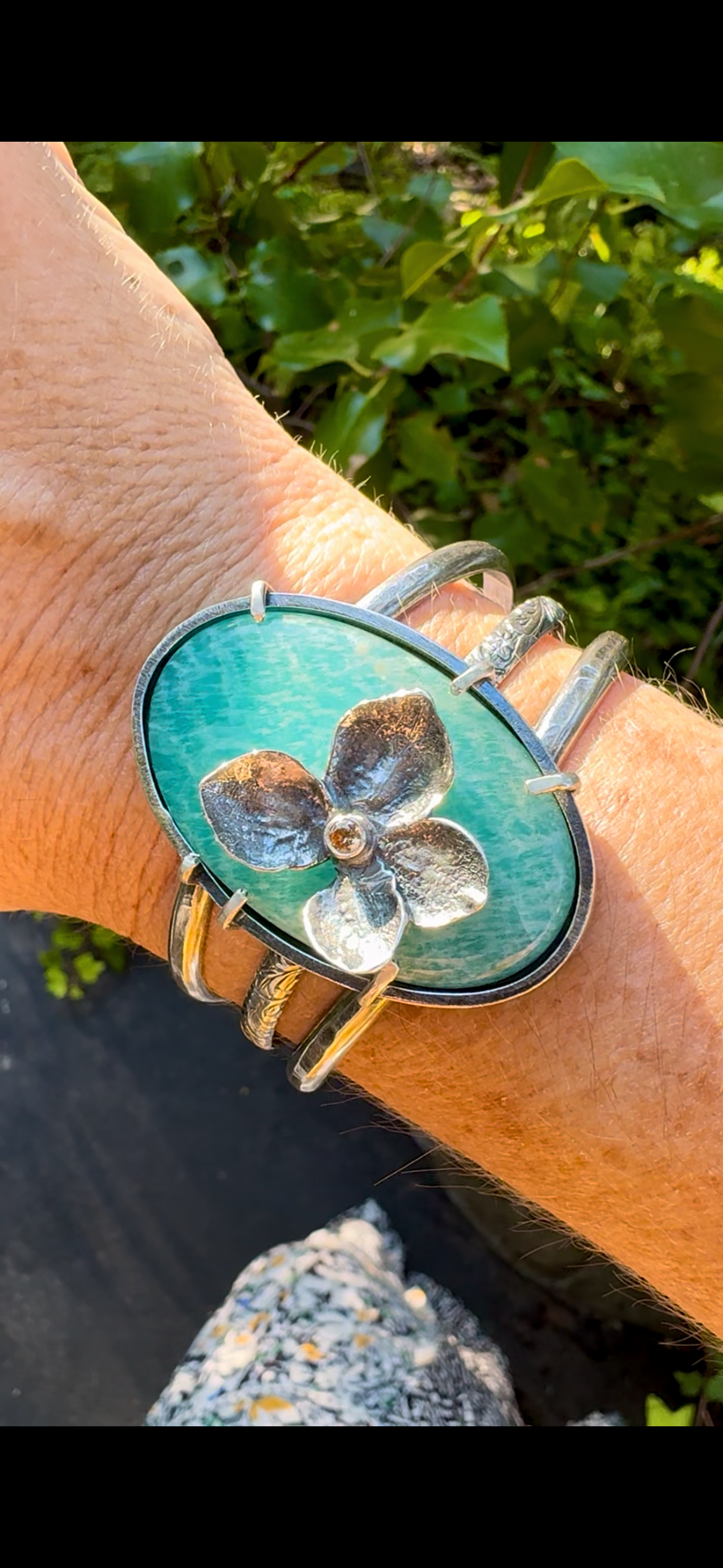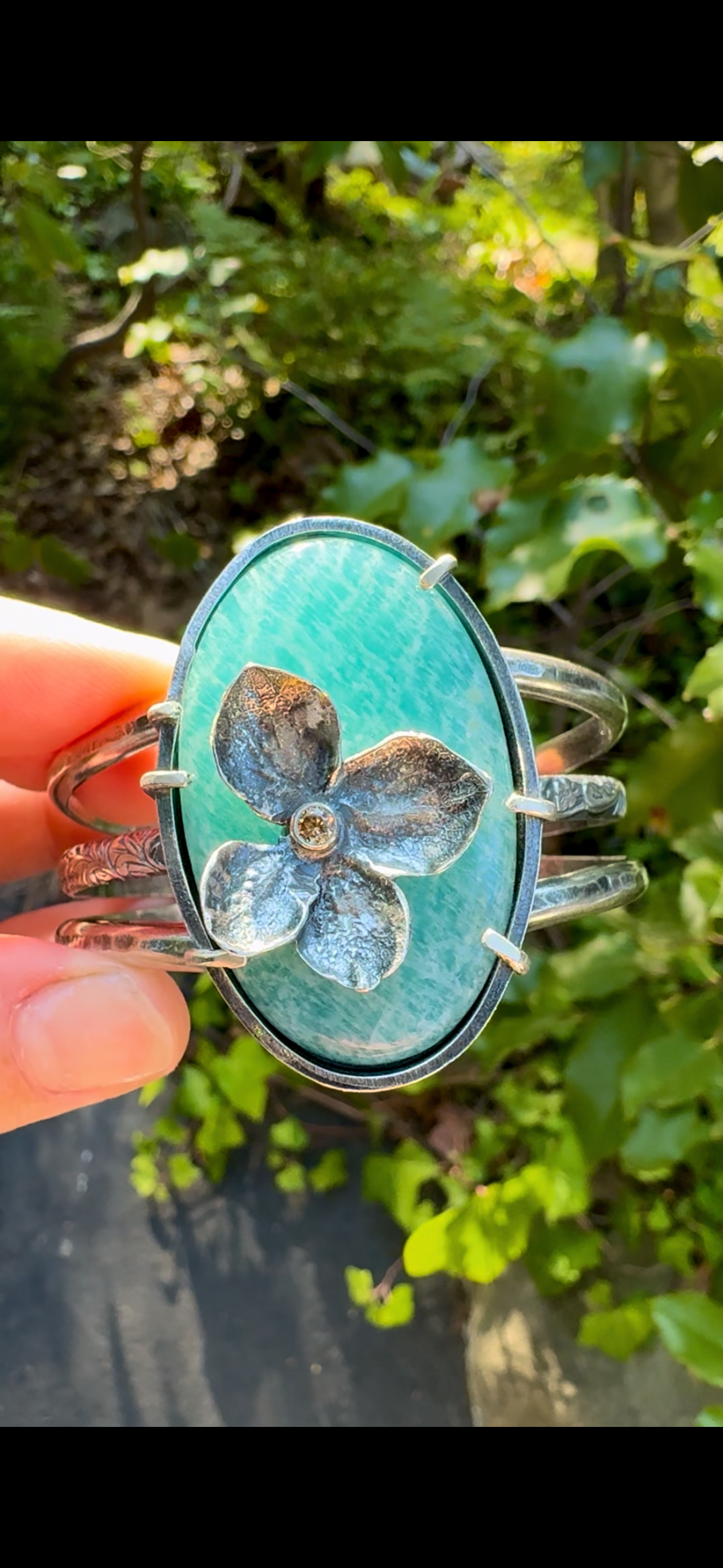 This jaw dropping cuff is a true one-of-a-kind statement piece, bold, detailed, and utterly unforgettable. At its heart is a delicate hand-sculpted sterling silver hydrangea, accented with a glowing citrine center set in a durable tube setting that runs straight through the stone. The warm golden hue of the citrine pairs beautifully with the dreamy aqua tones of the amazonite, securely nestled in a prong setting atop a triple layered wire cuff band.