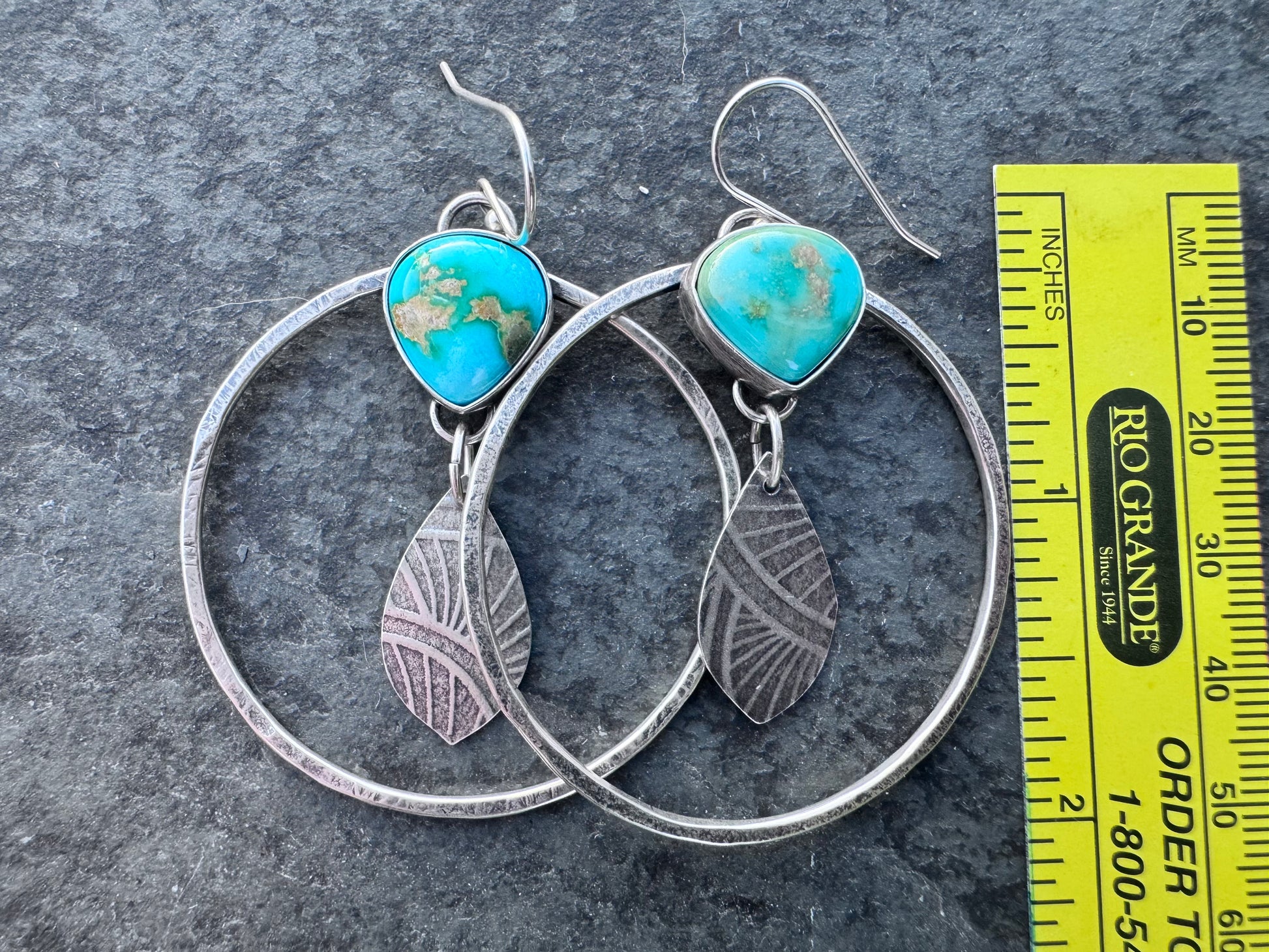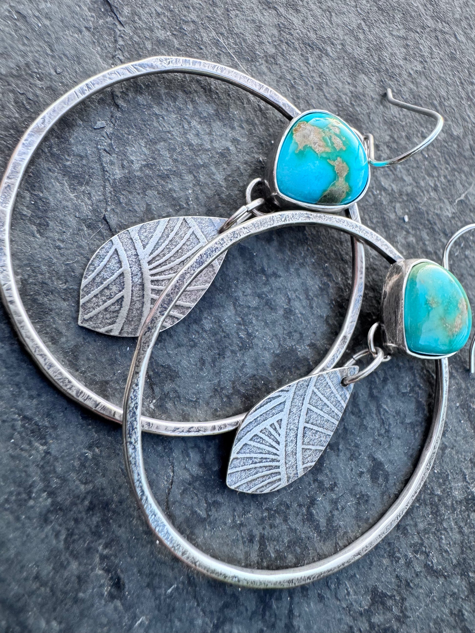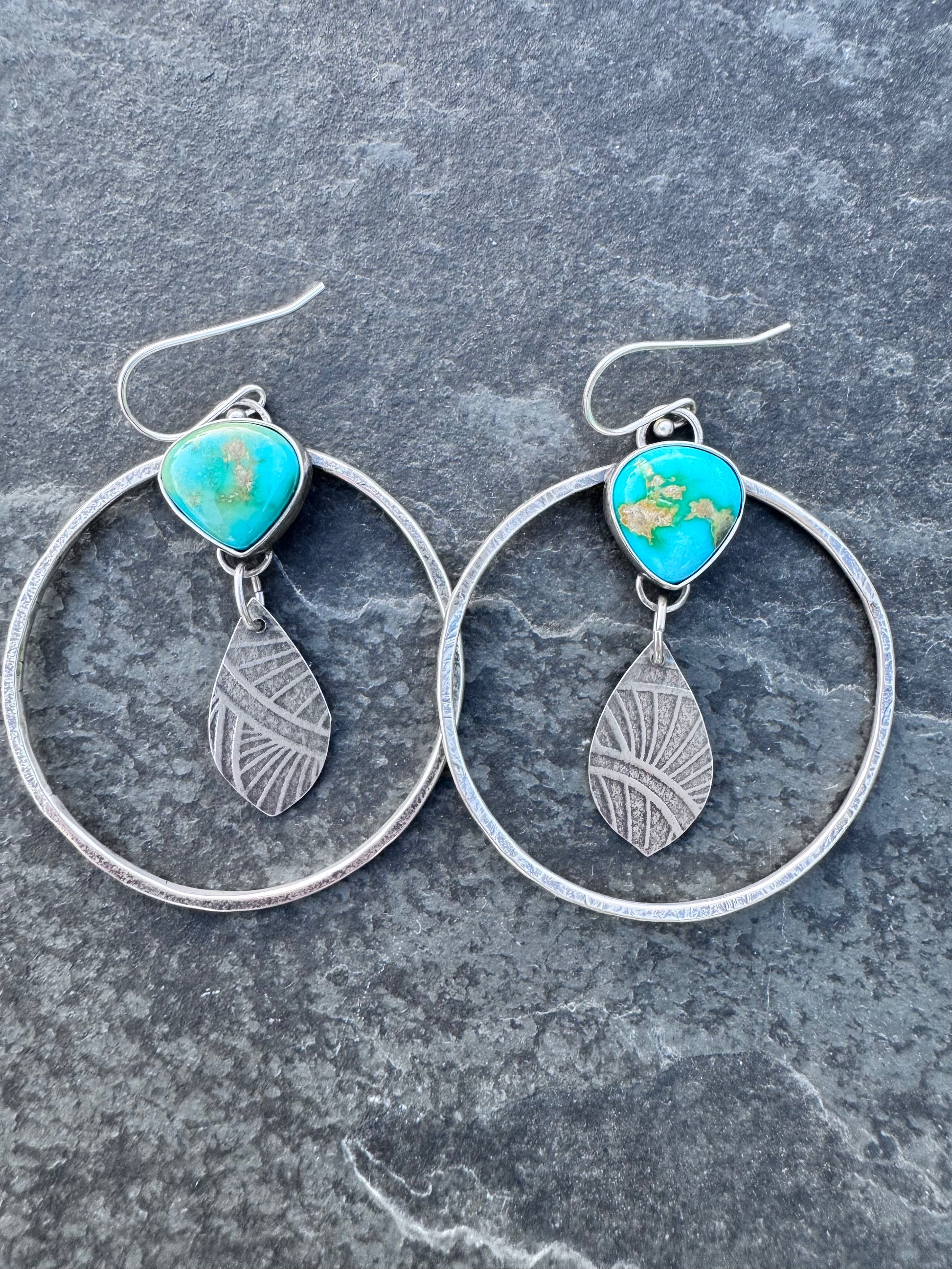 Perfect for a big hoop girl. Sterling silver hoops with a teardrop turquoise with a fun pattern dangle in the center. Great movement , great color.