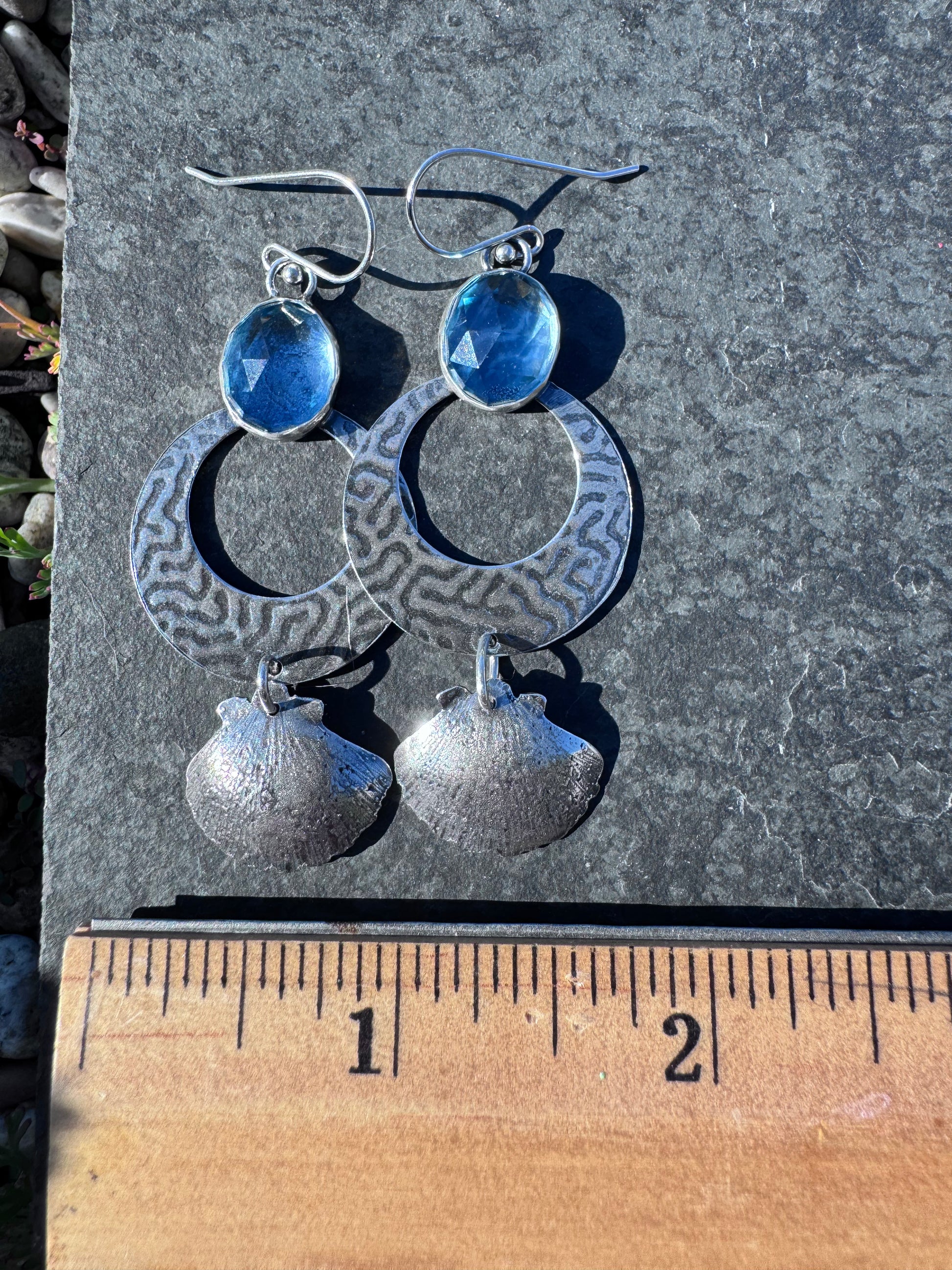 A gorgeous pair of sea lover hoops. Hand fabricated sterling silver seashells. Coral pattern hoops, with a dreamy faceted aquamarine stone. Sterling silver and stone. Super lightweight and comfortable. Great movement.